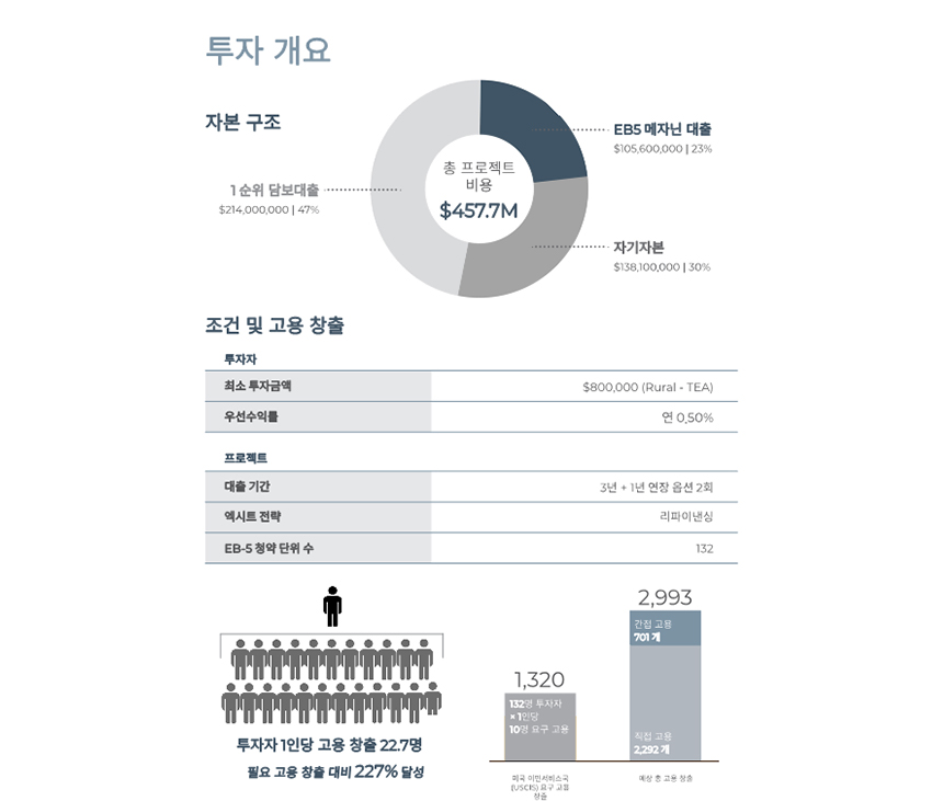2025³â 4ºÐ±â Âø°øÇÏ¿© 2028³â 4ºÐ±â±îÁö ¸ðµç ½Ã¼³ÀÇ Áذø°ú °í¿ë âÃ⠿ϷḦ ¸ñÇ¥·Î Çϰí ÀÖÀ¸¸ç, ÃÑ 2,993¸íÀÇ ÀÏÀÚ¸®¸¦ âÃâÇÒ °ÍÀ¸·Î ¿¹»óµË´Ï´Ù. ÀÌ´Â EB-5 ÅõÀÚÀÚ 1Àδç 22.7¸í ¼öÁØÀ¸·Î, À̹α¹ ¿ä°ÇÀÇ 227%¸¦ ´Þ¼º (127% °í¿ë Äí¼Ç)ÇÏ¿© ÅõÀÚÀÚµéÀÌ EB-5 ÇÁ·Î±×·¥ ¿ä°ÇÀ» ÃæºÐÈ÷ ÃæÁ·ÇÒ ¼ö ÀÖ´Â ±¸Á¶¸¦ °®Ãß°í ÀÖ½À´Ï´Ù.